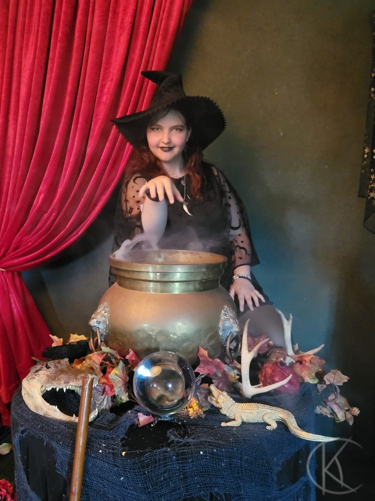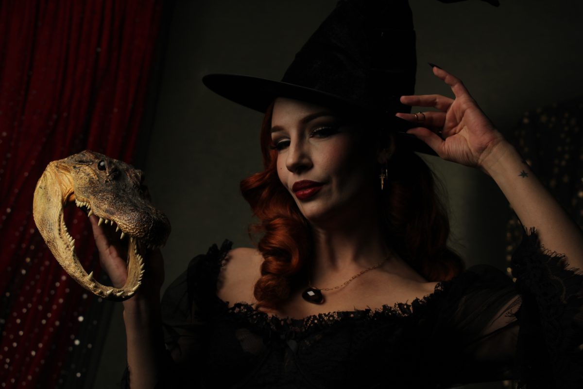 The “Bayou Witch” got the Setup in a green look with Bayou and nature based props to bring the witchy mood out. Due to her Louisiana background was model Sabra Saint Sin in her element. With her red hair and performer attitude she made a great fit for that role. We shot two rounds each and got amazing results. The first part was primarily the planned classic Bayou witch scene, in which props such as black crows, glass balls, alligator heads or skulls were used, while Sabrina posed around a bubbling and misty witch’s cauldron.
